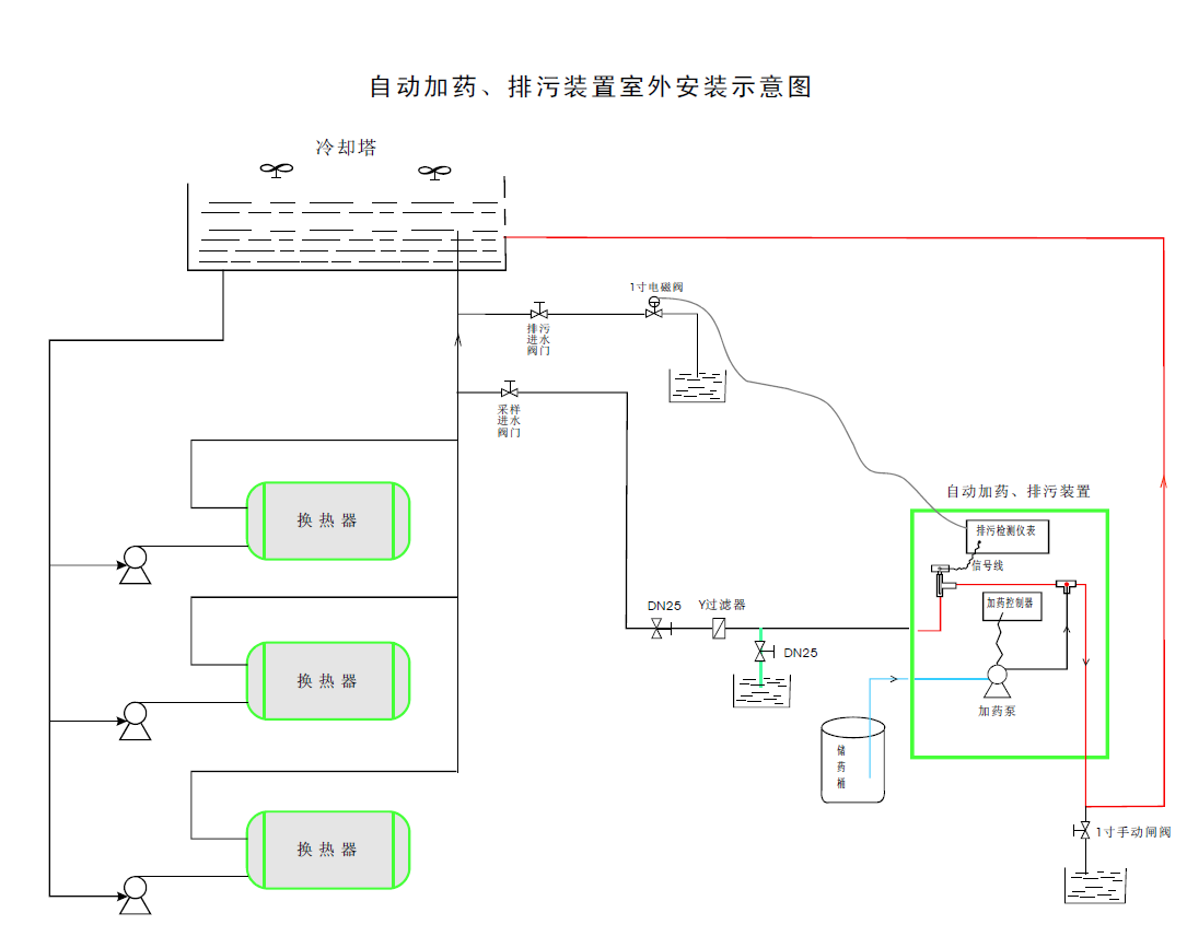 1. 設備上安裝有電導率儀,可以實時檢測循環水的電導率,當電導率超過設定的排污上限時自動打開排污電磁閥進行排水;當電導率下降至設定的排污下限后關閉電磁閥從而停止排污。